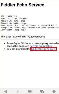 • 在你的手机浏览器中输入http://上面的ip:8888,点击FiddlerRoot certificate安装证书并添加至信任列表,如下图: